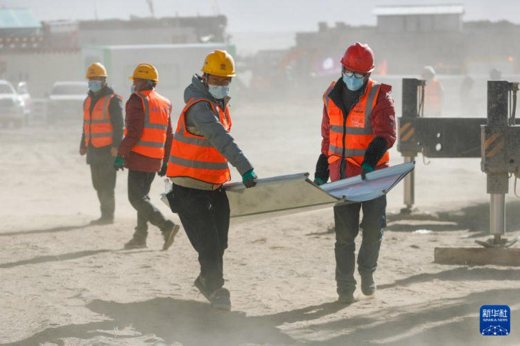 1月9日,在定日地震受灾严重的长所乡等地,各方救援建设者为让受灾群众尽早入住更为舒适的板房,更好地度过冬季,坚持在风沙中施工,抢抓建设进度。