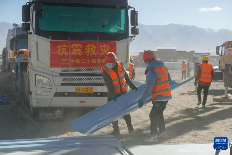 1月9日,在定日地震受灾严重的长所乡等地,各方救援建设者为让受灾群众尽早入住更为舒适的板房,更好地度过冬季,坚持在风沙中施工,抢抓建设进度。
