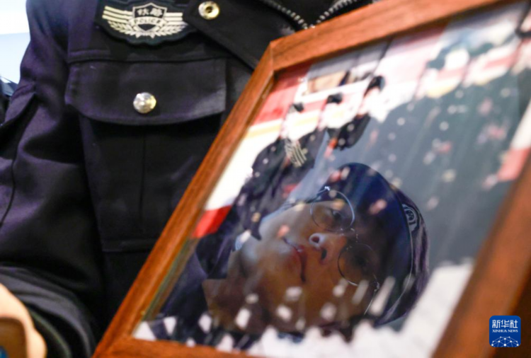1月8日,在出征仪式上,“丝路风华”女子乘警组成员马婉钰(左二)从老一代女乘警玛依努尔·吐尔逊(左一)手中接过老乘警合影照片作为留念。