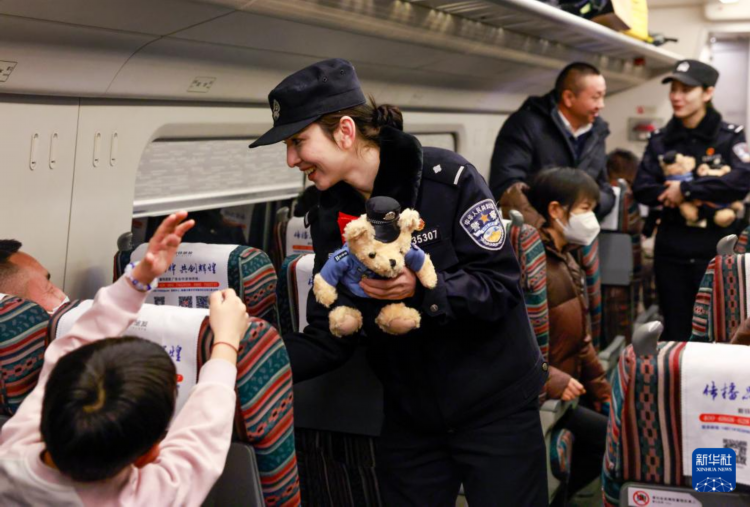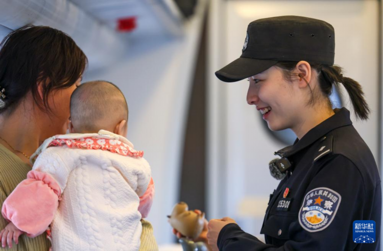 1月8日,在D8816次列车上,“丝路风华”女子乘警组成员马婉钰哄逗一名哭泣的婴儿。