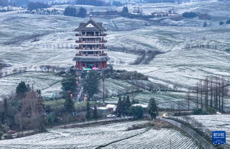 当日,位于贵州省遵义市湄潭县的万亩茶海迎来降雪,茶园被白雪覆盖,别有韵味。
