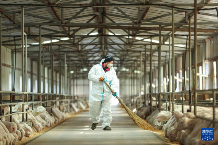 1月9日,在庆阳市环县毛井镇一家肉羊养殖合作社,工人打扫肉羊圈舍。