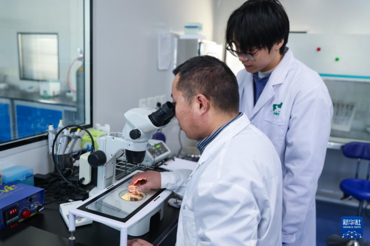 1月8日,在庆阳市环县山城乡八里铺村的肉羊育种基地的实验室,中国农业科学院兰州畜牧与兽药研究所研究员岳耀敬(左)检查种羔羊胚胎发育情况。