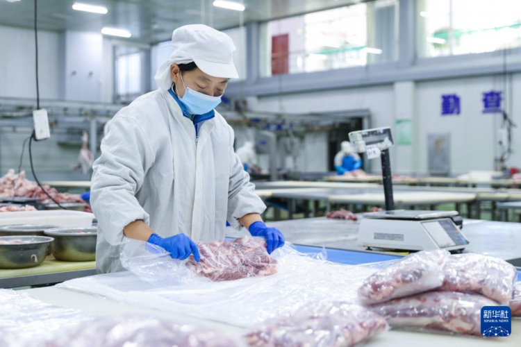 1月8日,在庆阳市环县一家羊肉加工企业生产车间,工作人员打包羊肉。