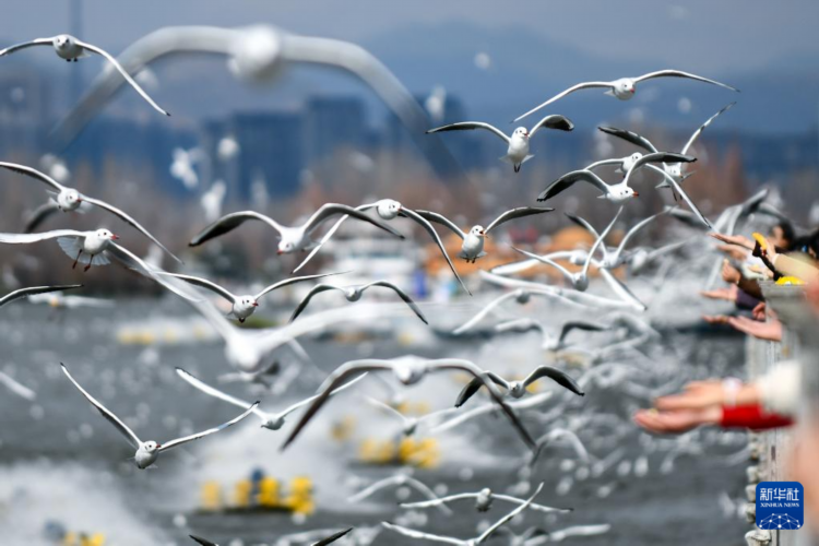 时下,云南省昆明市已进入观赏红嘴鸥的最佳季节。众多游客来到海埂大坝、海洪湿地公园等地观赏投喂红嘴鸥。