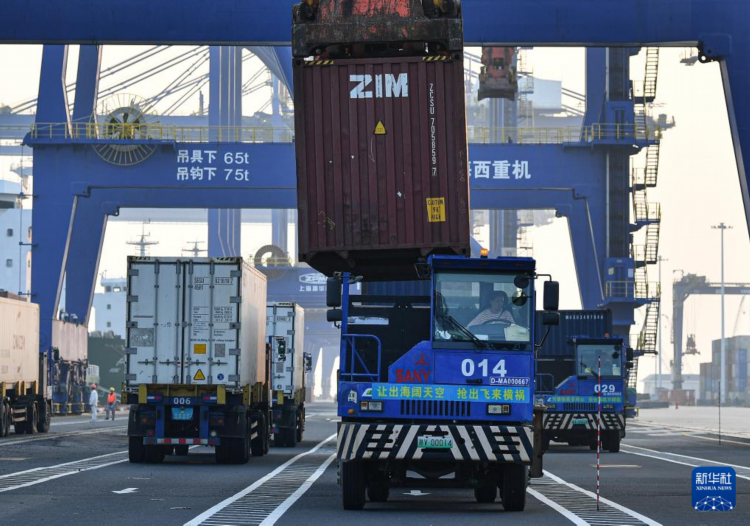 1月9日,工人在位于海南洋浦经济开发区的洋浦国际集装箱码头转运集装箱。