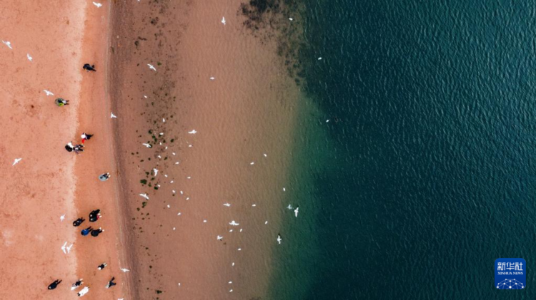 1月12日,游客在抚仙湖边游玩(无人机照片)。
