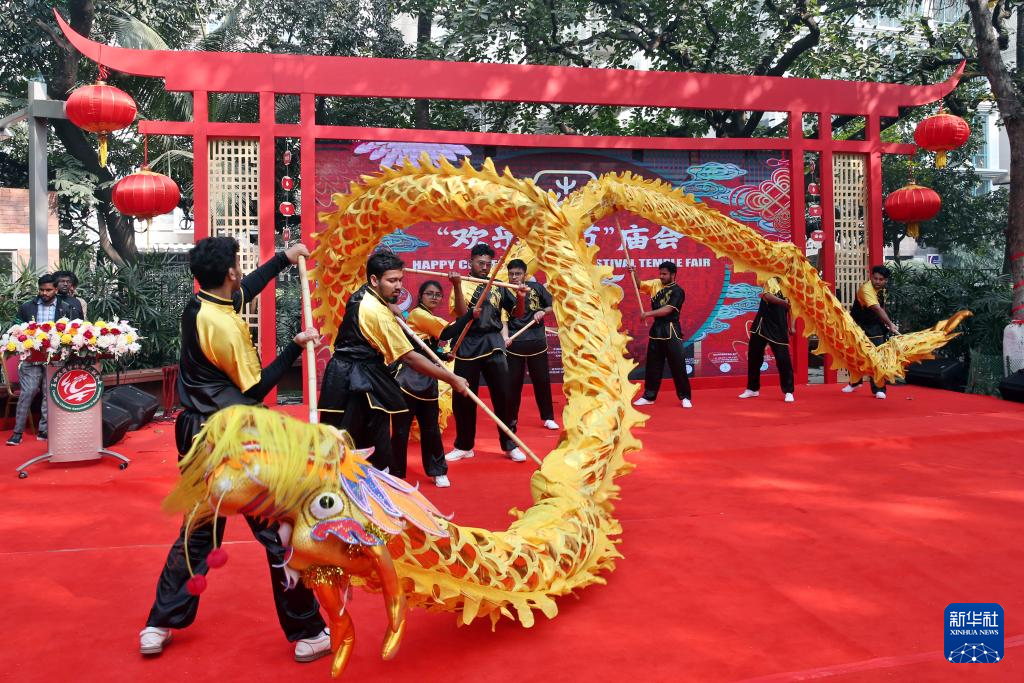 1月10日,在孟加拉国首都达卡,表演者在“欢乐春节”庙会上舞龙。