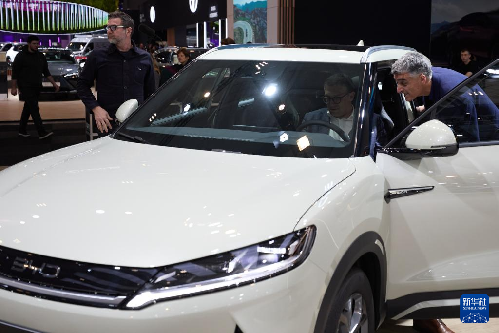 1月10日,观众在比利时布鲁塞尔举办的2025布鲁塞尔车展上参观比亚迪汽车。