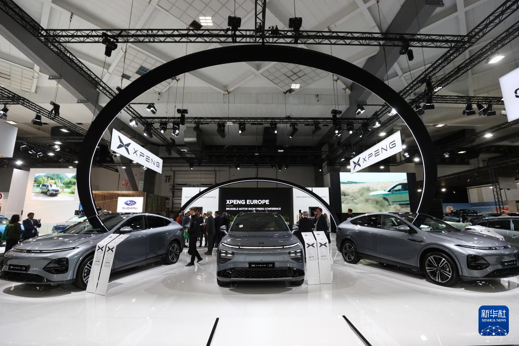 1月10日,在比利时布鲁塞尔举办的2025布鲁塞尔车展上,人们参观小鹏汽车展区。
