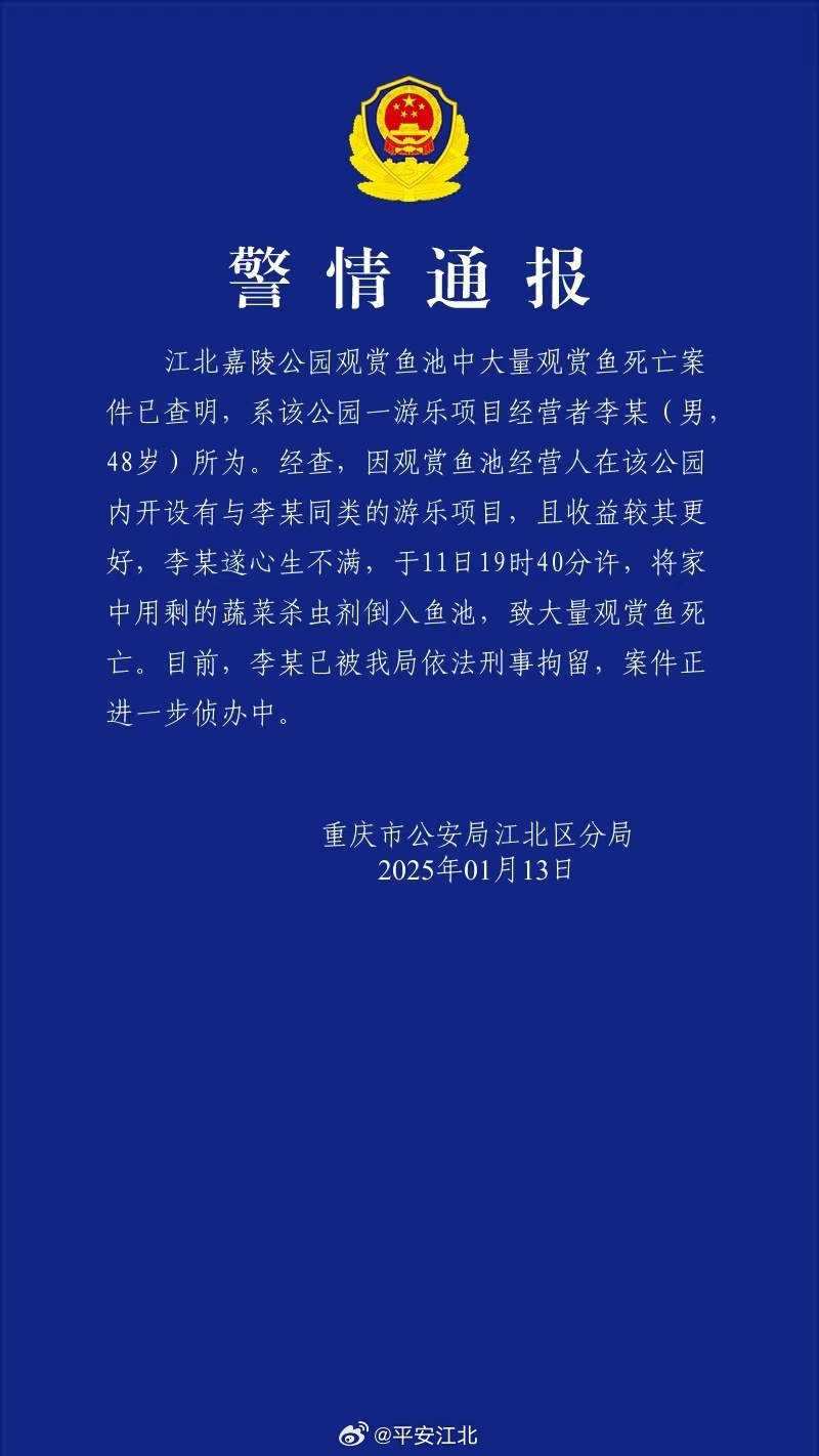 江北嘉陵公园观赏鱼池中大量观赏鱼死亡案件已查明,系该公园一游乐项目经营者李某(男,48岁)所为。经查,因观赏鱼池经营人在该公园内开设有与李某同类的游乐项目,且收益较其更好,李某遂心生不满,于11日19时40分许,将家中用剩的蔬菜杀虫剂倒入鱼池,致大量观赏鱼死亡。