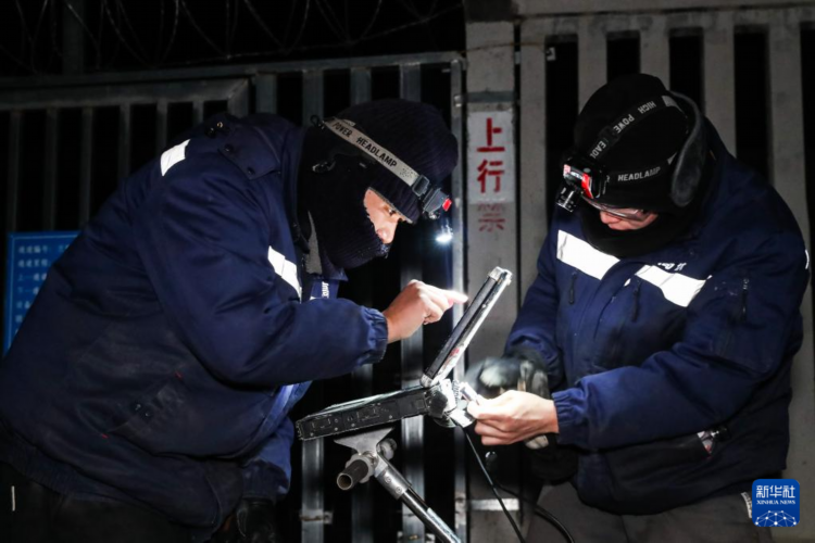 1月13日晚,在新乌鞘岭隧道通道门外,两名线路工组装铁路轨道检查仪。