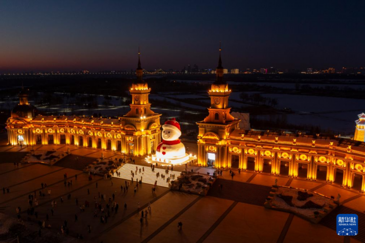 1月3日,游客在哈尔滨群力音乐公园“网红大雪人”附近游玩(无人机照片)。