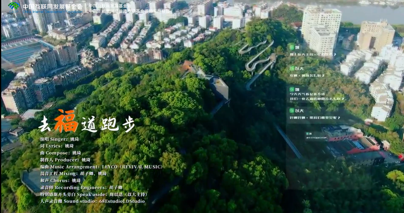 “海丝情”展播(36) 作品名称:去福道跑步 作词:姚琦 作曲:姚琦 演唱:姚琦 创作介绍:《去福道跑步》是一首funky时尚欢快电子音乐风格的作品,歌曲用欢快时尚有态度的说唱讲述了追梦的心境,歌词说的 “感受福州最美的地图,不要忘记心中的蓝图”“打卡福道的长度,专心的在梦想里跑步” 也很适合带着耳机边跑步边听!歌曲有着品质感的编曲和编舞,还有福建歌曲中少有的唱跳funky风格融合中国风。听完了歌曲,更有能量了,也“看见快乐在空中飞舞" !