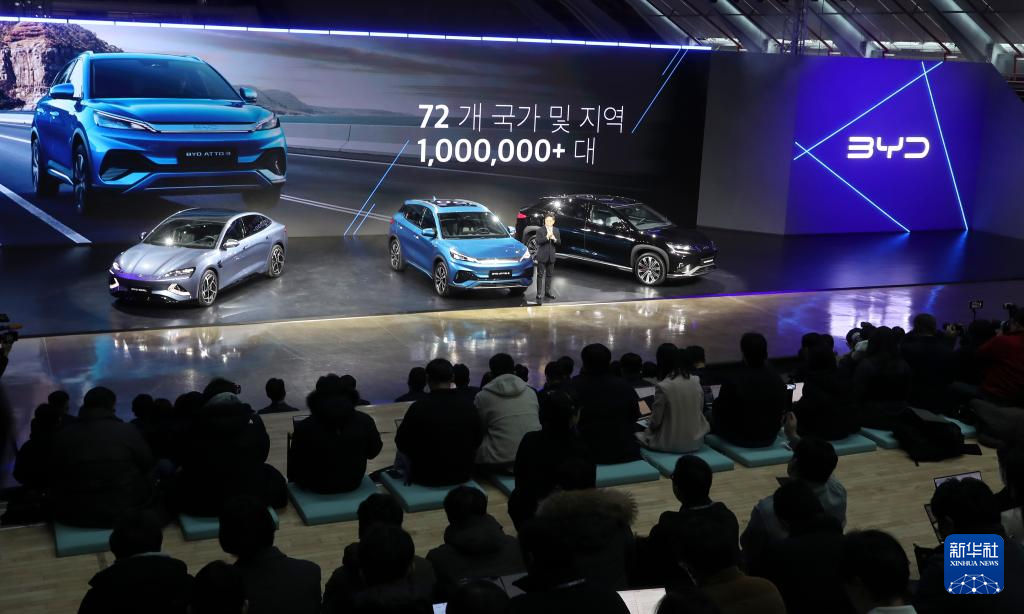 1月16日,在韩国仁川,主持人介绍比亚迪将在韩国发售的三款车型。新华社记者 姚琪琳 摄 在发布会上,比亚迪亚太汽车销售事业部总经理刘学亮表示,比亚迪在韩国市场已深耕近10年,带来电动叉车、电动巴士以及1吨级电动卡车等产品。随着比亚迪乘用车品牌的发布,期待能共同推动低碳出行与绿色经济,助力全球可持续发展。