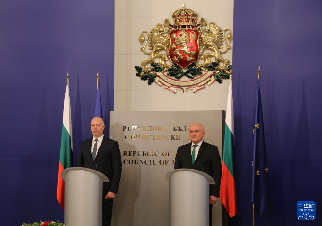 1月16日,在保加利亚索非亚,罗森·热利亚兹科夫(左)与看守内阁总理迪米特尔·格拉夫切夫(右)在新一届内阁名单获批后共同发表讲话。新华社记者 林浩 摄