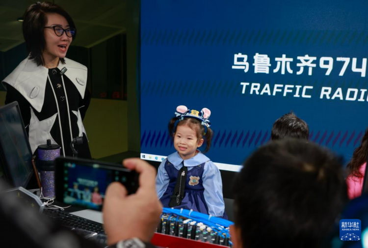 1月16日,在乌鲁木齐市公安局交通警察支队,小朋友参观当地交通广播直播间。