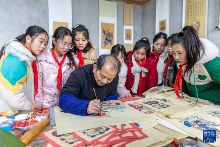 1月14日,在重庆市梁平区屏锦镇,屏锦第三中心小学学生观看梁平木版年画国家级代表性传承人徐家辉为年画描色。