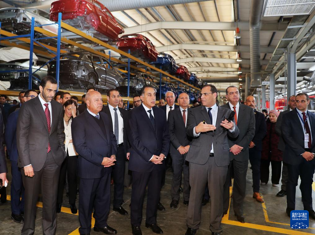 1月15日,在埃及吉萨省的十月六日城,埃及总理马德布利(前中)参观吉利汽车埃及工厂生产线。