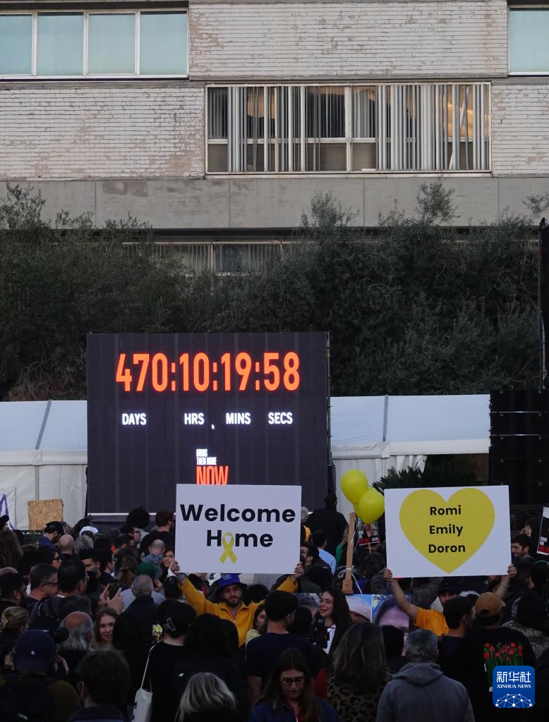 1月19日,人们在以色列特拉维夫的一座广场集会,欢迎3名以色列人被释放回国。新华社记者 王卓伦 摄