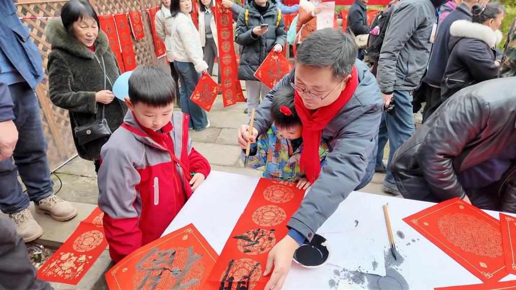 在当日的非遗巡游环节,鲤鱼灯、舞龙舞狮、杂耍、川剧变脸吐火、塘河镇婚俗唢呐、状元巡街、财神送福等精彩节目接连上演,吸引众多游客驻足拍照;在非遗文化体验互动区,书法家们挥毫泼墨,将书法艺术、民俗文化融为一体,创作出一幅幅作品,游客们排起长队,依次领取“新年祝福”。