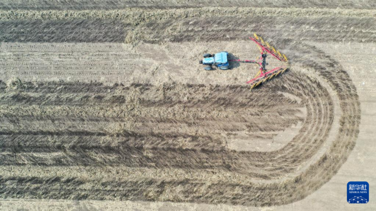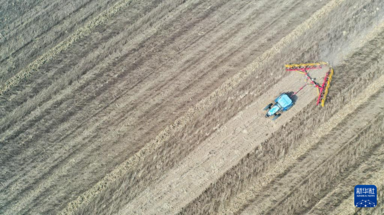 2024年4月2日,农民在吉林省公主岭市范家屯镇驾驶农机整理耕地里的秸秆(无人机照片)。 新华社记者 张楠 摄