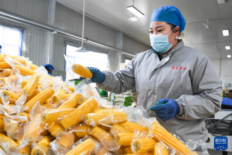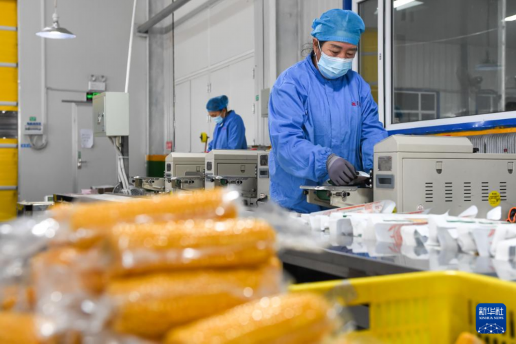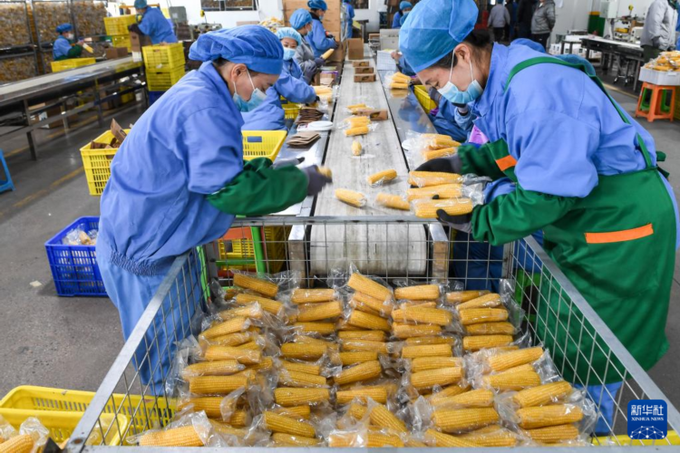 2024年1月25日,在位于吉林省公主岭市的吉林德乐农业开发有限公司,工人包装鲜食玉米。 新华社记者 张楠 摄