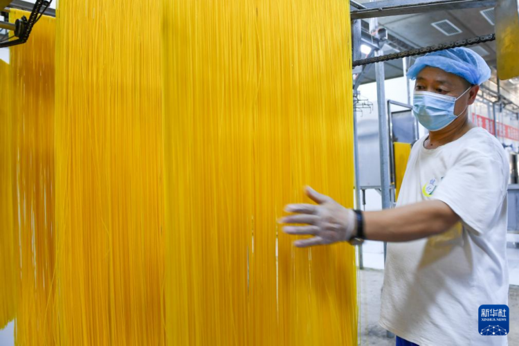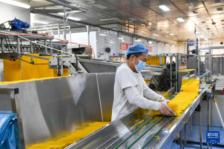 2024年1月25日,在公主岭市健亿农业综合开发有限责任公司,工人查看玉米面条生产情况。 新华社记者 张楠 摄