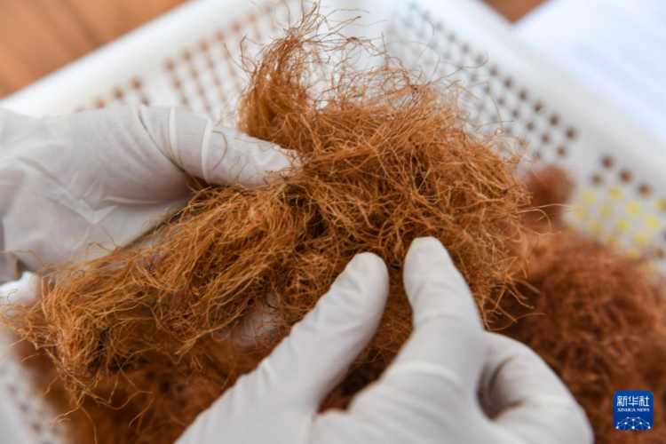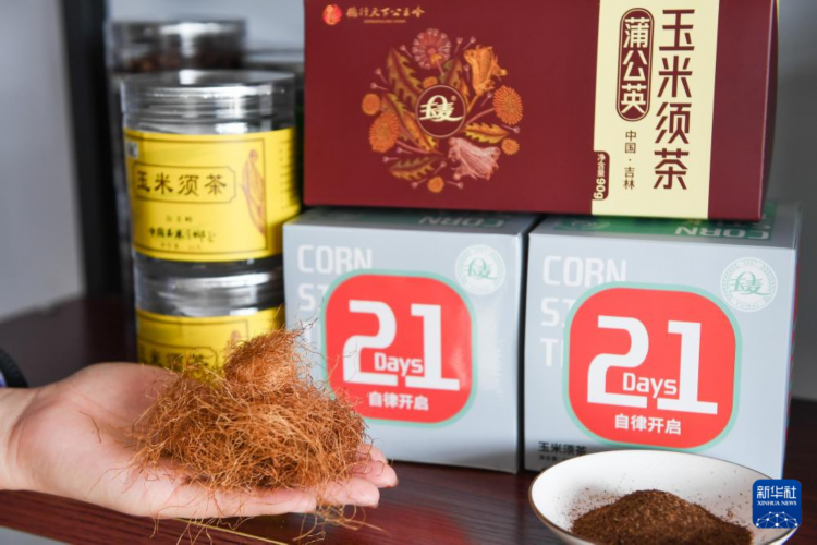 2024年1月25日,在公主岭国家农业科技园区九正生物医药科技有限公司,工人展示玉米须产品。 新华社记者 张楠 摄