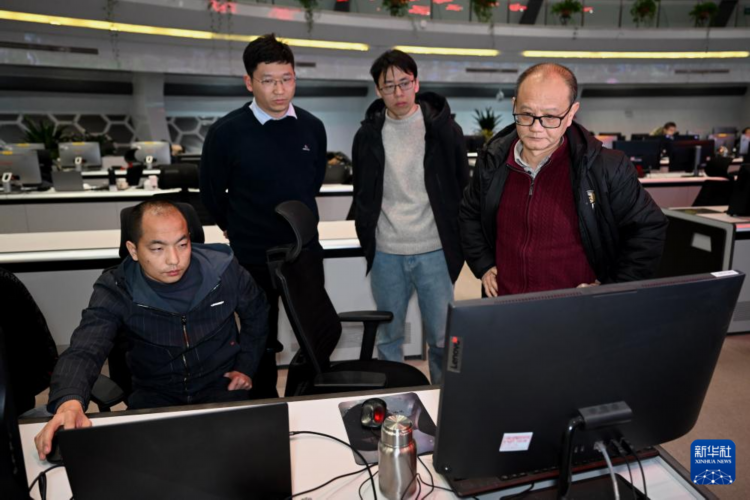 1月16日,在全超导托卡马克核聚变实验装置(EAST)控制大厅,EAST物理实验总负责人龚先祖(右一)在一次冲击实验后与同事交流实验数据。