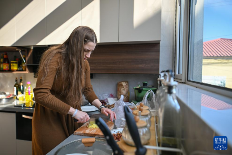 在天津市蓟州区官庄镇南营村,欧阳莎莎在切菜准备午餐(1月19日摄)。