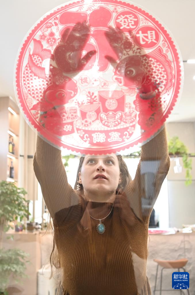 在天津市蓟州区官庄镇南营村,欧阳莎莎在贴窗花(1月19日摄)。