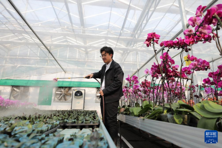 1月21日,在蝴蝶兰种植基地内,基地负责人在管护蝴蝶兰种苗。