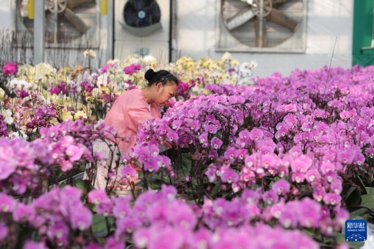 1月21日,在蝴蝶兰种植基地内,基地负责人在管护蝴蝶兰种苗。