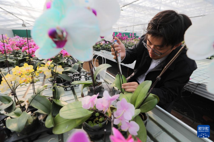 1月21日,在蝴蝶兰种植基地内,基地负责人在管护蝴蝶兰种苗。