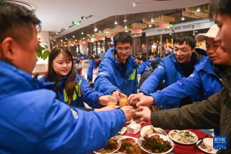 1月22日,快递员和家属在“年夜饭”活动上碰杯。