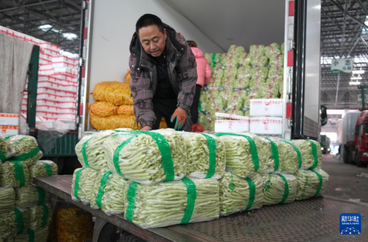 1月22日,在位于山东省寿光市的寿光地利农产品物流园,工作人员在装运蔬菜。