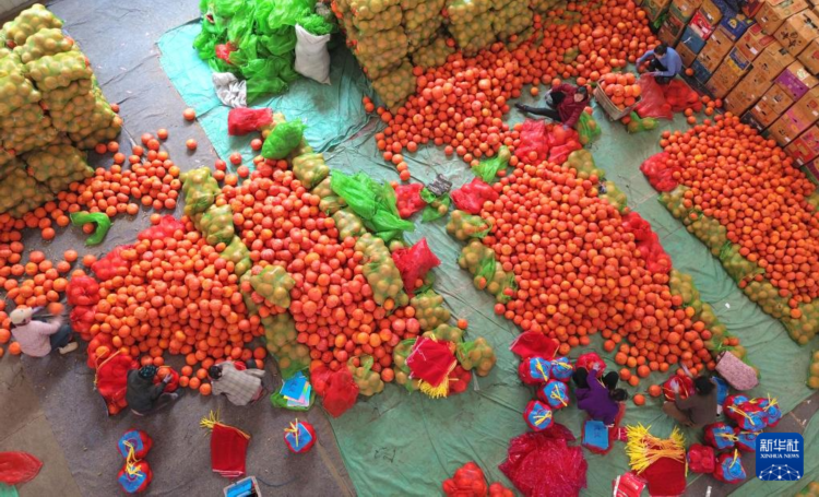 1月21日,在位于山东省寿光市的寿光地利农产品物流园,工作人员在对南瓜进行分级、包装(无人机照片)。