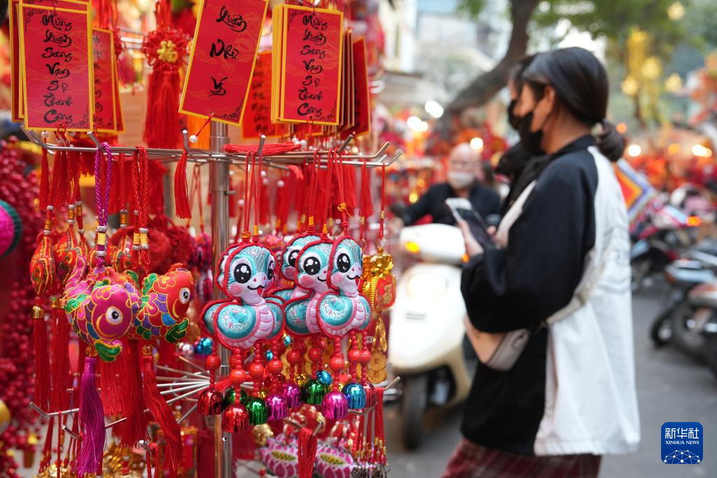 这是1月22日在越南首都河内马市街拍摄的春节装饰品。 农历春节是越南重要的节日。求字、贴春联、买桃花、包方粽等传统习俗延续至今。春节前夕,越南首都河内的马市街早已换上了一种新颜色——“春节红”。民众涌向此处,置年货、拍美照,传统年味飘出新风尚。 新华社记者 胡佳丽 摄