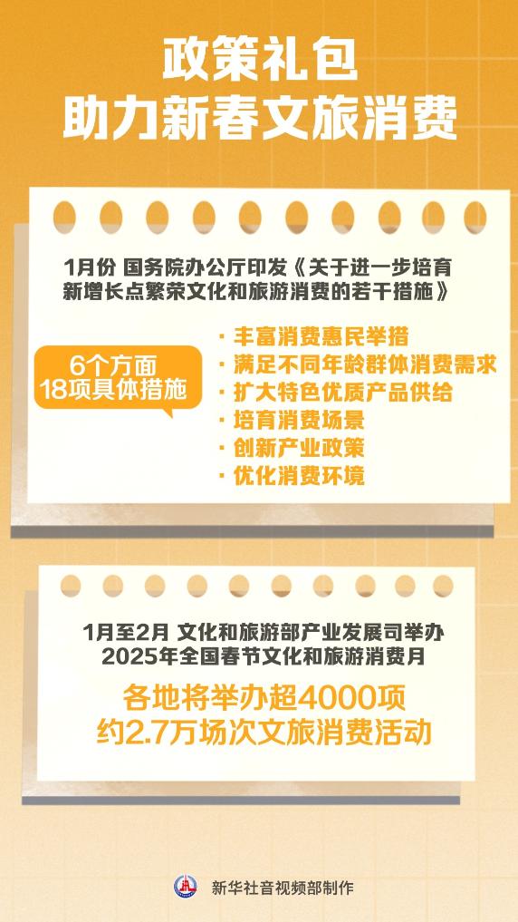 2025年1月国务院办公厅印发《关于进一步培育新增长点繁荣文化和旅游消费的若干措施》、文化和旅游部产业发展司于1月至2月举办2025年全国春节文化和旅游消费月……一系列促消费政策措施,给人们带来实惠便利的文旅体验,营造欢乐祥和的节日氛围,让旅游过年、过文化年成为新年俗,为人民群众春节假期美好生活赋能添彩。
