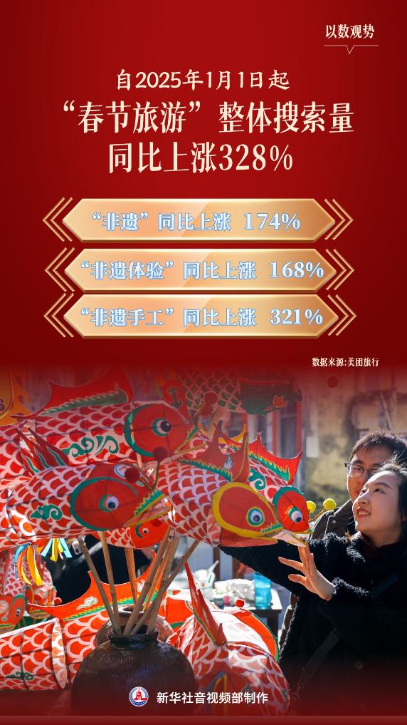 在春节申遗成功的推动下,全球目光聚焦中国年,吸引了大量国内外游客参与各种非遗活动。据美团旅行数据显示,自2025年1月1日起,“春节旅游”整体搜索量同比上涨328%,其中“非遗”相关搜索量同比增长174%,尤其是“非遗体验”和“非遗手工”的搜索量分别增长了168%和321%。