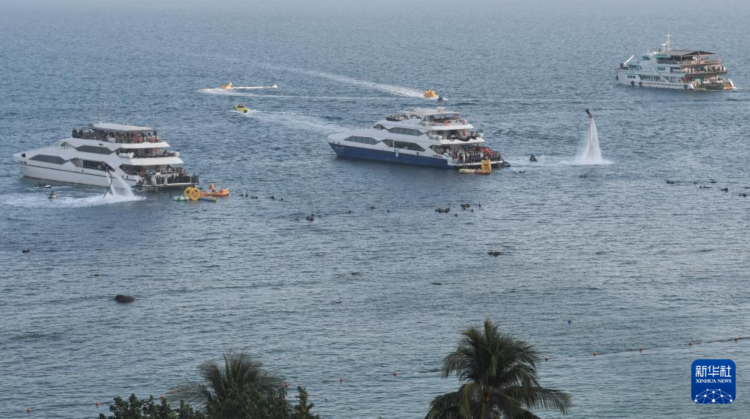 1月23日,在三亚市大东海景区海域,游客乘坐游艇游玩。