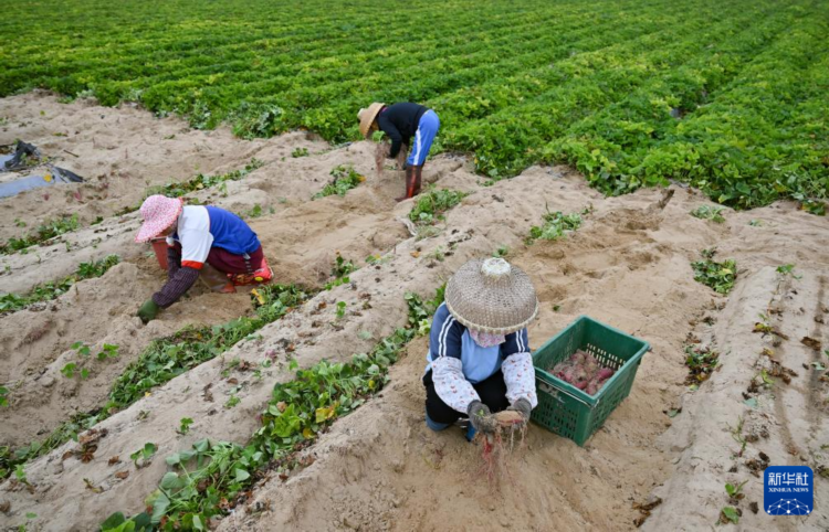 1月23日,工人在文昌市铺前镇田间采收地瓜。