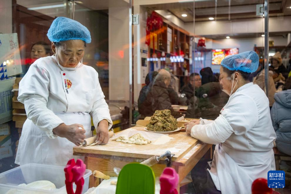 1月24日,在“中国雪乡”景区,一家餐厅的工作人员在包饺子。