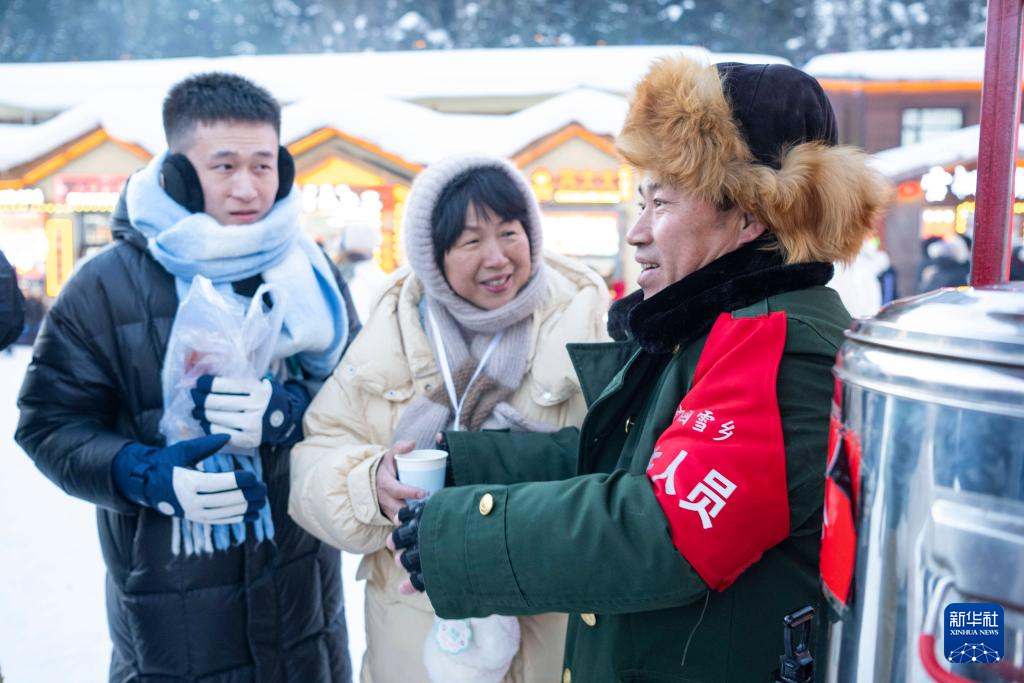 1月24日,在“中国雪乡”景区,工作人员为游客发放免费姜汤。