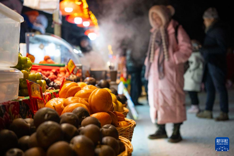 1月24日,在“中国雪乡”景区,游客选购冻梨、冻柿子等东北特色食品。