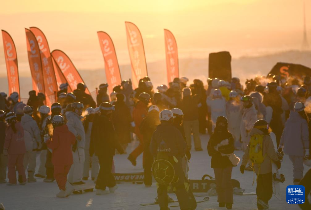 日落时分,阿勒泰市将军山国际滑雪度假区的山顶区域人头攒动(1月24日摄)。