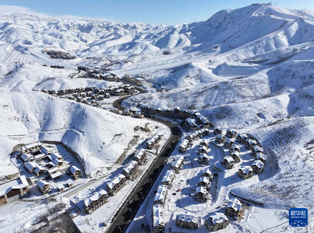 将军山国际滑雪度假区周边的酒店、民宿等商业建筑群(1月24日摄,无人机照片)。