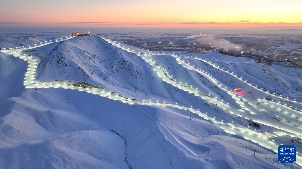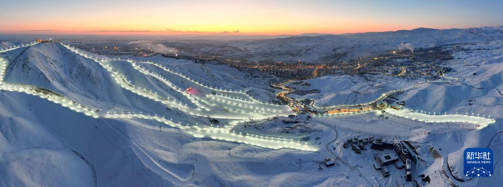 黄昏时分的将军山国际滑雪度假区(1月24日摄,无人机照片)。将军山国际滑雪度假区在夜间开放多条雪道,以满足“雪友”多样化需求。