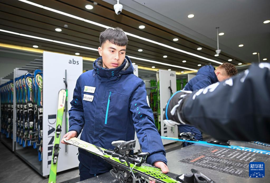 将军山国际滑雪度假区员工斯拉吉丁·热依木为“雪友”整理滑雪板(1月24日摄)。他毕业后在这里工作已有四年。